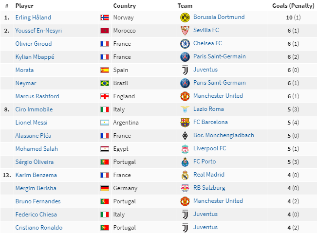 Theo đó, Mbappe đã có 6 pha lập công tại Cúp C1 châu Âu mùa này, bằng với số bàn thắng của người đồng đội Neymar. Dẫn đầu danh sách vẫn đang là tiền đạo Erling Haaland của Dortmund. Chân sút sinh năm 2000 cũng có 4 bàn thắng ở vòng 1/8 khi đối đầu Sevilla.