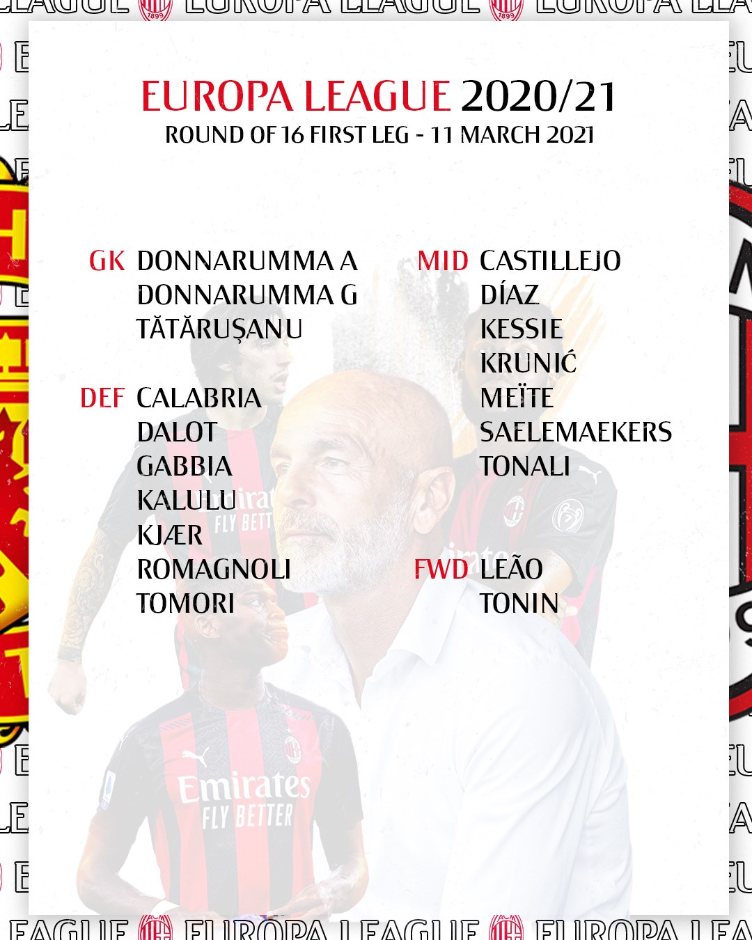 Tuy nhiên, theo thông báo mới nhất của AC Milan, Ibrahimovic sẽ bỏ lỡ trận lượt đi vì chấn thương. Theo Hernandez, Ismael Bennacer, Hakan Calhanoglu, Ante Rebic và Mario Mandzukic là 5 cầu thủ khác của đội bóng áo đỏ thành Milano đang phải chạy đua với thời gian để hy vọng tái xuất ở trận lượt về vào ngày 19/3.