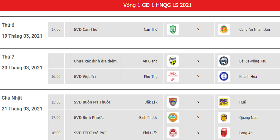 Lịch thi đấu vòng 1 giải hạng nhất quốc gia 2021