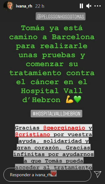 “Tomas đang trên đường đến Barcelona để bắt đầu quá trình điều trị ung thư tại Bệnh viện Vall d'Hebron. Cảm ơn Georgina và Cristiano Ronaldo vì nghĩa cử cao đẹp và trái tim nhân hậu. Cảm ơn vì đã giúp Tomas”, chị gái Ivana của Georgina Rodriguez chia sẻ.