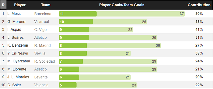 Xếp sau Messi trong cuộc đua hướng tới giải thưởng pichichi mùa này là Gerard Moreno. Ngôi sao thuộc biên chế CLB Villarreal có ít hơn 1 bàn so với cầu thủ ghi nhiều bàn thắng nhất lịch sử giải đấu. Với 9 pha lập công, Luis Suarez và Iago Aspas đồng xếp ở vị trí thứ 3.