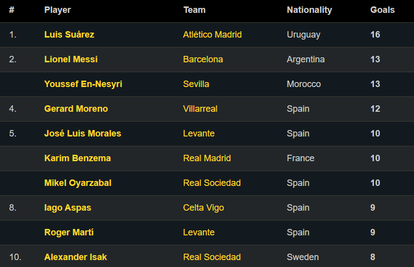 Với 16 bàn thắng, Suarez tiếp tục củng cố vững chắc vị trí số 1 trên bảng xếp hạng Top ghi bàn La Liga. Tiền đạo sinh năm 1987 chỉ cần 1.284 phút để ghi 16 bàn, đạt hiệu suất 80,25 phút/1 bàn thắng.