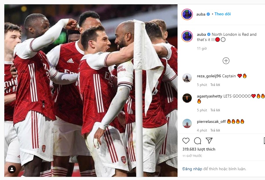 Về phần mình, Aubameyang vẫn chưa có phản hồi chính thức về án phạt song cựu tiền đạo Dortmund vẫn đẳng tải dòng trạng thái “North London is Red and that’s it !!! – Bắc London là màu đỏ và đó là tất cả” cùng hình ảnh ăn mừng của các cầu thủ Arsenal trong trận đấu với Tottenham trên Instagram.