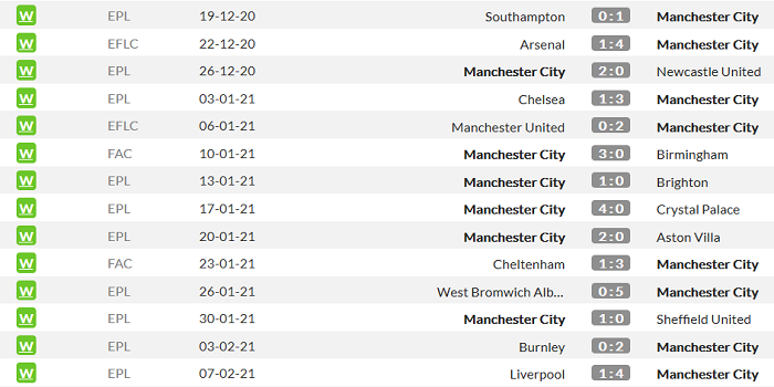 Chuỗi 14 chiến thắng của Man City bắt đầu từ ngày 19/12: đánh bại Southampton trên sân khách với tỷ số 1-0. Các cầu thủ dưới trướng HLV Pep Guardiola chỉ không phải nhận bàn thua trong 11/14 chiến thắng này. Riêng tại giải Ngoại hạng Anh, The Citizens thắng 10 trận liên tiếp và có tới 8 trận không phải nhận bàn thua.