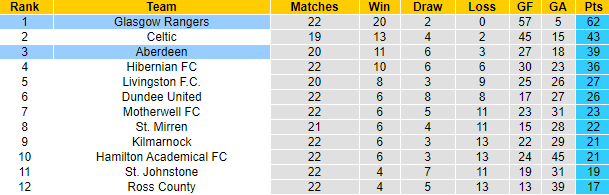 Rangers của HLV Steven Gerrard vẫn đang bất bại tại giải VĐQG Scotland. Sau 22 trận, Rangers thắng 20, hòa 2, giành 62 điểm và dẫn đầu bảng xếp hạng. Khoảng cách mà Rangers tạo ra so với đội xếp thứ 2 Celtic lúc này đã lên tới 19 điểm.