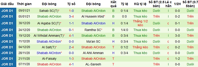 + Thống kê 10 trận gần nhất của Shabab Al Ordon
