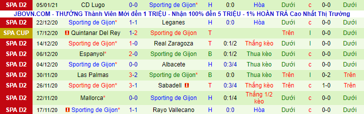 + Thống kê 10 trận gần nhất của Gijon