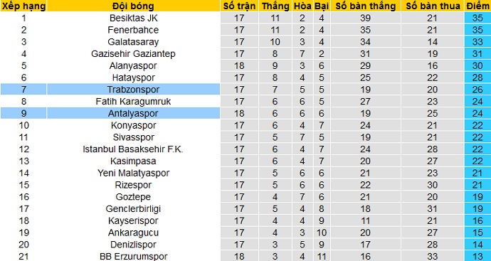Bảng xếp hạng giải VĐQG Thổ Nhĩ Kỳ vòng 18