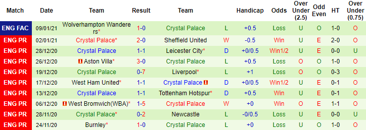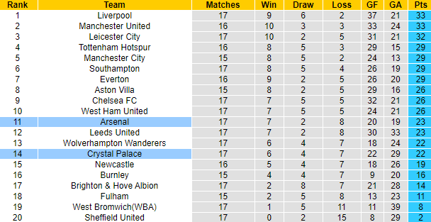 Crystal Palace bất bại cả 4 trận đối đầu Arsenal gần đây trong khuôn khổ Ngoại hạng Anh với 1 chiến thắng và 3 trận hòa. Sau 17 vòng đấu tại Premier League 2020/21, Crystal Palace giành 22 điểm, chỉ kém Arsenal 1 điểm. Tuy nhiên ở trận đấu sắp tới trên sân Emirates, Crystal Palace lại không hứa hẹn vào khả năng có điểm.