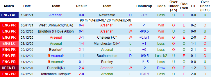 + Thống kê 10 trận gần nhất của Arsenal