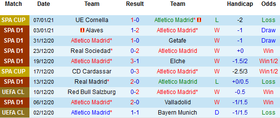 + Thống kê 10 trận gần nhất của Atletico Madrid