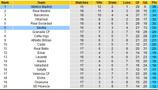 Ở chiều ngược lại, Sevilla dù được đầu tư mạnh mẽ về nhân sự hồi đầu mùa nhưng vẫn chưa mang lại sự yên tâm cho giới mộ điệu. Ra sân nhiều hơn 1 trận so với Atletico Madrid nhưng đội khách bị bỏ cách tới 8 điểm là khoảng cách dễ thấy nhất.