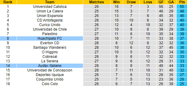 Audax Italiano với số trận tương tự mới giành được 33 điểm, xếp ở vị trí thứ 14. Tuy nhiên điều đáng bàn là ở trận đối đầu sắp tới Audax Italiano vẫn được tin tưởng vào khả năng đánh bại Huachipato. Audax Italiano cho thấy phong độ khởi sắc với chuỗi 3 trận liên tiếp bất bại gần đây.