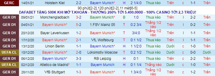 + Thống kê 10 trận gần nhất của Bayern Munich