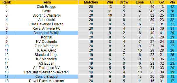 Sau 19 vòng đấu tại giải VĐQG Bỉ mùa này, Cercle Brugge mới giành được 18 điểm, xếp thứ 17 trên bảng xếp hạng. 6 trận gần đây Cercle Brugge toàn thua cả về tỷ số lẫn kèo châu Á. Bên kia chiến tuyến, Beerschot Wilrijk đang xếp ở vị trí thứ 7 với 29 điểm sau 19 trận. Trên sân nhà Beerschot Wilrijk thắng 5, hòa 1 trong vòng 7 trận vừa qua tại giải đấu số 1 quốc nội.