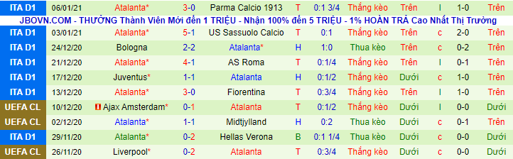 + Thống kê 10 trận gần nhất của Atalanta