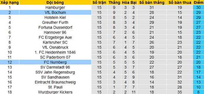 Trong khi đó Nürnberg chỉ đứng thứ 12 trên bảng xếp hạng với 20 điểm cũng sau 15 vòng đấu. Hiện tại vị trí của Nürnberg vẫn đang khá an toàn khi xếp trên nhóm các đội cầm đèn đỏ 4 bậc với khoảng cách đang là 7 điểm.