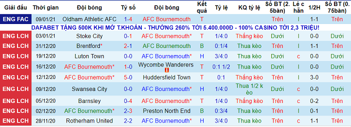 Bournemouth là 1 trong những đội có tỷ lệ thắng kèo trên sân nhà cao nhất Championship 2020/21. Tỷ lệ thắng kèo trên sân nhà của họ lên tới 60%, cao thứ 5 toàn giải. Riêng 4 trận sân nhà gần nhất thì Bournemouth thắng kèo tới 3.