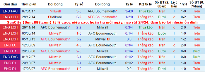 Phong độ và thống kê đối đầu Bournemouth - Millwall gần đây
