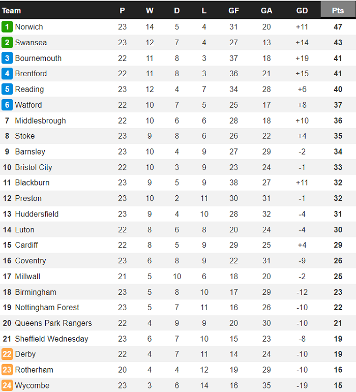 Bảng xếp hạng Championship mới nhất