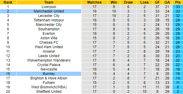 Burnley toàn thua cả 4 trận tiếp đón Man United gần đây trên sân nhà, thủng lưới 7 lần mà không ghi nổi 1 bàn danh dự. Trên bảng xếp hạng Premier League 2020/21, Man United đang xếp thứ 2 với 33 điểm, bằng điểm đội đầu bảng Liverpool nhưng đá ít hơn 1 trận.