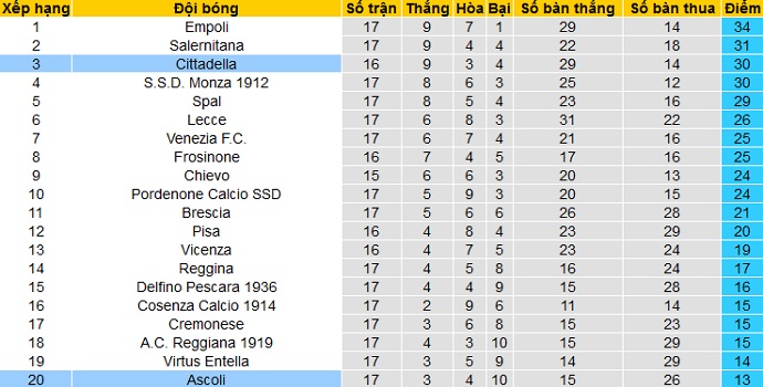 Trái lại Ascoli đang đứng ở vị trí bét bảng xếp hạng khi mới chỉ có được 13 điểm sau 17 vòng đấu. Tuy Ascoli kém các đội trong nhóm trụ hạng tới 5 bậc nhưng khoảng cách đến đội đứng thứ 15 hiện cũng chỉ là 3 điểm.