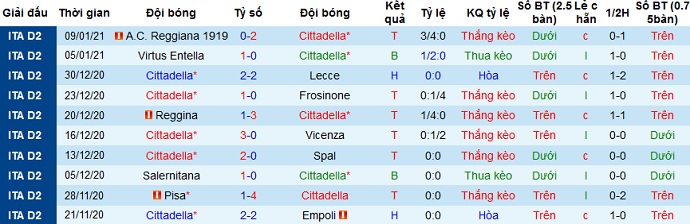 + Thống kê 10 trận gần nhất của Cittadella