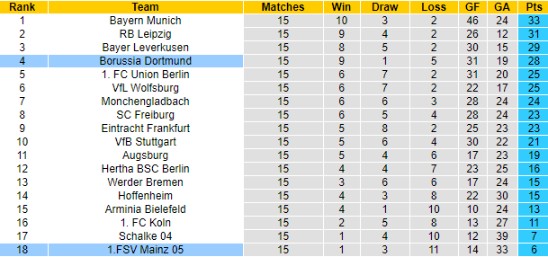 Bên phía đối diện, Mainz đang xếp ở vị trí đội sổ với vỏn vẹn 6 điểm sau 15 trận. Lực lượng mỏng, đội hình lại liên tiếp bị chấn thương tàn phá, Mainz không cho thấy khả năng gượng dậy trong tương lai gần. 4 trận gần đây Mainz toàn thua, thủng lưới 10 lần.