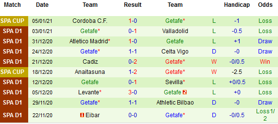 + Thống kê 10 trận gần nhất của Getafe