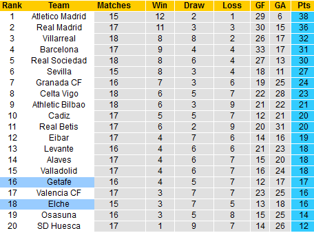 Elche với 16 điểm sau 15 trận đã đấu bị đẩy xuống thứ 3 từ dưới lên, trong khi Getafe chỉ nhiều hơn 1 điểm nhưng cũng nhiều hơn 1 trận xếp ở vị trí thứ 16. Với tương quan như vậy, kinh nghiệm của Getafe đang nhận được đánh giá tích cực hơn.