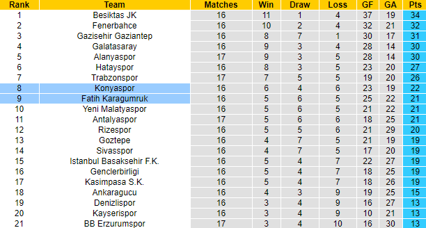Konyaspor đang xếp trên Fatih Karagumruk 1 bậc với khoảng cách 1 điểm. Thế nhưng trước một đối thủ mới thăng hạng, Konyaspor vẫn phải xếp chiếu dưới trong cuộc đối đầu sắp tới. Điều đó cho thấy đội khách không được tin tưởng vào khả năng có điểm. Trên sân khách, Konyaspor thường xuyên đánh mất mình, 6 trận gần đây họ để thua 4 lần cả về tỷ số và kèo châu Á.