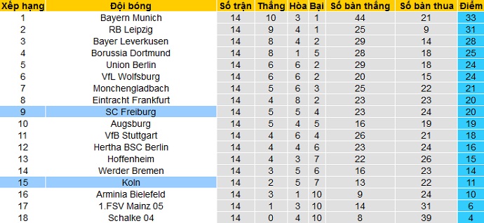Trong khi đó FC Köln chỉ đang đứng thứ 15 của bảng xếp hạng với 11 điểm có được sau 14 vòng đấu. Hiện tại Köln đang đứng ngay trên nhóm cầm đèn đỏ, chỉ hơn đội thứ 16 Arminia Bielefeld đúng 1 điểm.