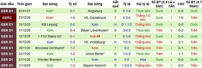 Trong 5 trận gần nhất Köln cũng có được 2 trận thắng, 1 trận hòa và 2 trận thua. Thế nhưng trên sân khách Köln lại đang bất bai trong cả 5 lần du đấu gần nhất trong đó có 2 trận thắng và cầm hòa 3 trận.