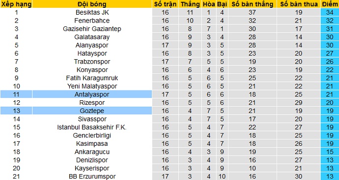 Trong khi đó Antalyaspor đứng trên đối thủ 2 bậc ở vị trí thứ 11 và cũng chỉ có nhiều hơn 2 điểm nhưng đã thi đấu nhiều hơn 1 trận. Antalyaspor đang có bằng điểm với 2 đội xếp ngay trên nhưng kém về hiệu số bàn thắng, và hiện đang cách nhóm các đội Top 4 tới 9 điểm.