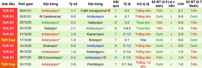 Ở 5 vòng đấu gần nhất Antalyaspor có được 2 trận thắng, 1 trận hòa và để thua 2 trận. Tuy nhiên trên sân khách kể từ đầu mùa giải đến nay Antalyaspor chưa thắng được trận nào mặc dù ở 5 trận du đấu gần nhất Antalyaspor có đến 4 trận hòa.