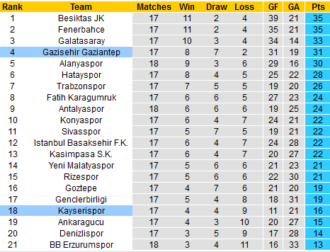 Ở chiều ngược lại, Kayserispor thậm chí phải đối mặt với nhiều khó khăn và có nguy rơ rớt hạng. Đội khách đang đứng thứ 4 từ dưới lên khi mới có 16 điểm sau 17 trận. Đáng nói, Kayserispor là đội có hàng công tệ nhất giải khi mới có 11 bàn thắng từ đầu mùa.