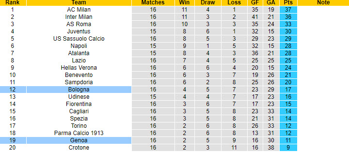 Genoa đang nỗ lực tích luỹ điểm số để có thể thoát khỏi nhóm cầm đèn đỏ cùa giải VĐQG Italia. Thực tế, họ đã có những tín hiệu lạc quan khi giành 1 trận thắng, hoà 1 và thua 1 ở 3 lượt trận vừa rồi. Dẫu vậy, thầy trò HLV Ballardini vẫn ngụm lặn ở vị trí áp chót trên bảng tổng sắp.