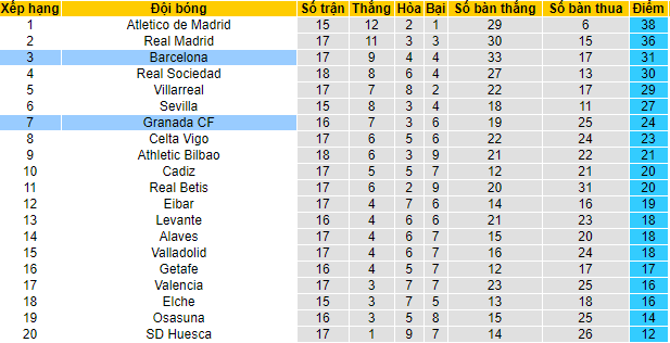 Sau chuỗi trận ấn tượng trước đó, Granada đang gặp khó trong những vòng đấu mới nhất. 3 lần ra sân vừa qua, đội chủ nhà đã nhận đến 2 trận thua. Đáng nói hơn, hàng công của họ chỉ ghi được một bàn thắng duy nhất trong những trận đấu đó. Với 24 điểm có được sau 16 vòng, Granada tụt xuống vị trí thứ 7 trên BXH.