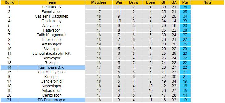 Nhìn qua, Kasimpasa bước vào trận đấu muộn vòng 19 giải VĐQG Thổ Nhĩ Kỳ với phong độ thất thường khi thắng đúng 1 trận, còn lại là 1 trận hòa và nhận tới 3 thất bại trong 5 vòng đấu vừa rồi. Mới đây, họ có thêm 1 trận thua tại cúp QG Thổ Nhĩ Kỳ.