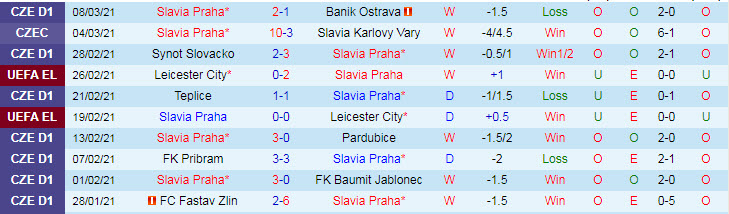 + Thống kê 10 trận gần nhất của Slavia Praha