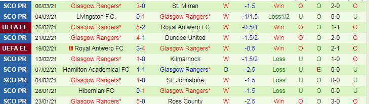 Riêng tại mặt trận cúp C2 châu Âu 2020/21, Rangers đang là một trong số ít đội bóng có được mạch trận bất bại. Chi tiết, họ thắng tới 9 và chỉ hòa 2 sau 11 trận đã đá kể từ vòng sơ loại tới giờ.