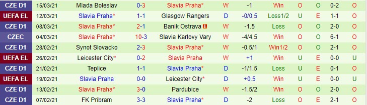 + Thống kê 10 trận gần nhất của Slavia Praha