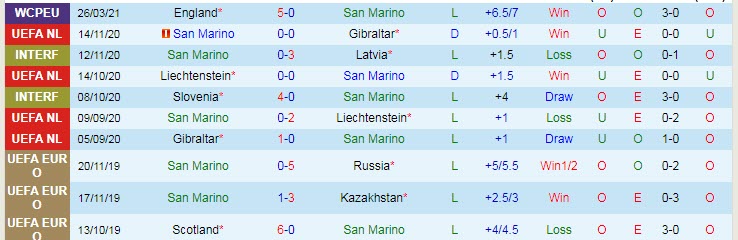+ Thống kê 10 trận gần nhất của San Marino
