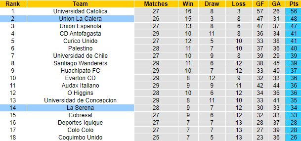 La Serena đang xếp thứ 2 trên bảng xếp hạng với 48 điểm sau 26 trận. Trong khi đó Union La Calera mới giành được 34 điểm sau 28 trận, xếp ở vị trí thứ 14. 5 vòng đấu gần đây Union La Calera bị đánh bại tới 4 lần. Rõ ràng đội khách không có nhiều cơ hội để cản đà thăng tiến của La Serena.