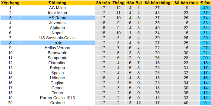 Trong khi đó, Lazio có phần gây thất vọng. Ciro Immobile cùng các đồng đội chỉ thu về 28 điểm sau 17 trận (thắng 8, hòa 4, thua 5) và xếp thứ 8 trước khi vòng 18 khởi tranh.