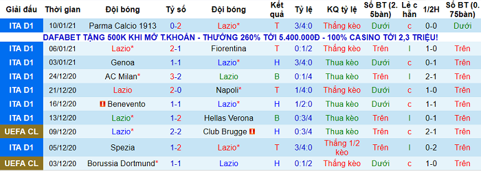 - Thống kê 10 trận gần nhất của Lazio