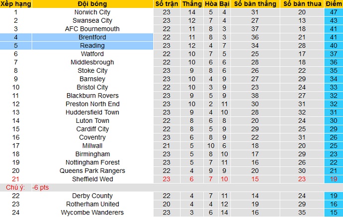 Bảng xếp hạng giải hạng nhất Anh sau vòng 23