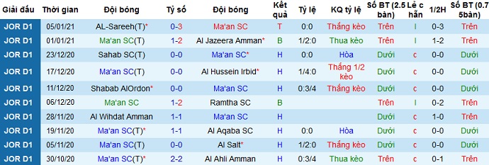+ Thống kê 10 trận gần nhất của Ma'an