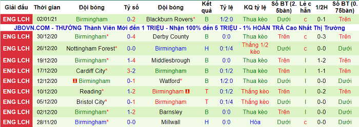 - Thống kê 10 trận gần nhất của Birmingham