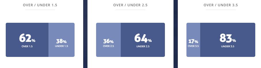 Cùng với đó, điều đáng lắng nghe nhất từ Ygeteb ở trận này là tổng số bàn thắng sẽ khó mà vượt qua mốc 3 bàn, khi mà cả 3 kịch bản siêu máy tính đưa ra đều chỉ có nhiều nhất 2 bàn thắng được ghi sau 90 phút tranh tài sắp tới. Cụ thể hơn nữa, Ygeteb đã xác nhận chỉ số khả thi của cửa Under 2.5 (dưới 3 bàn thắng) là khá cao, với 83% độ tin cậy. Rất đáng để đặt niềm tin!